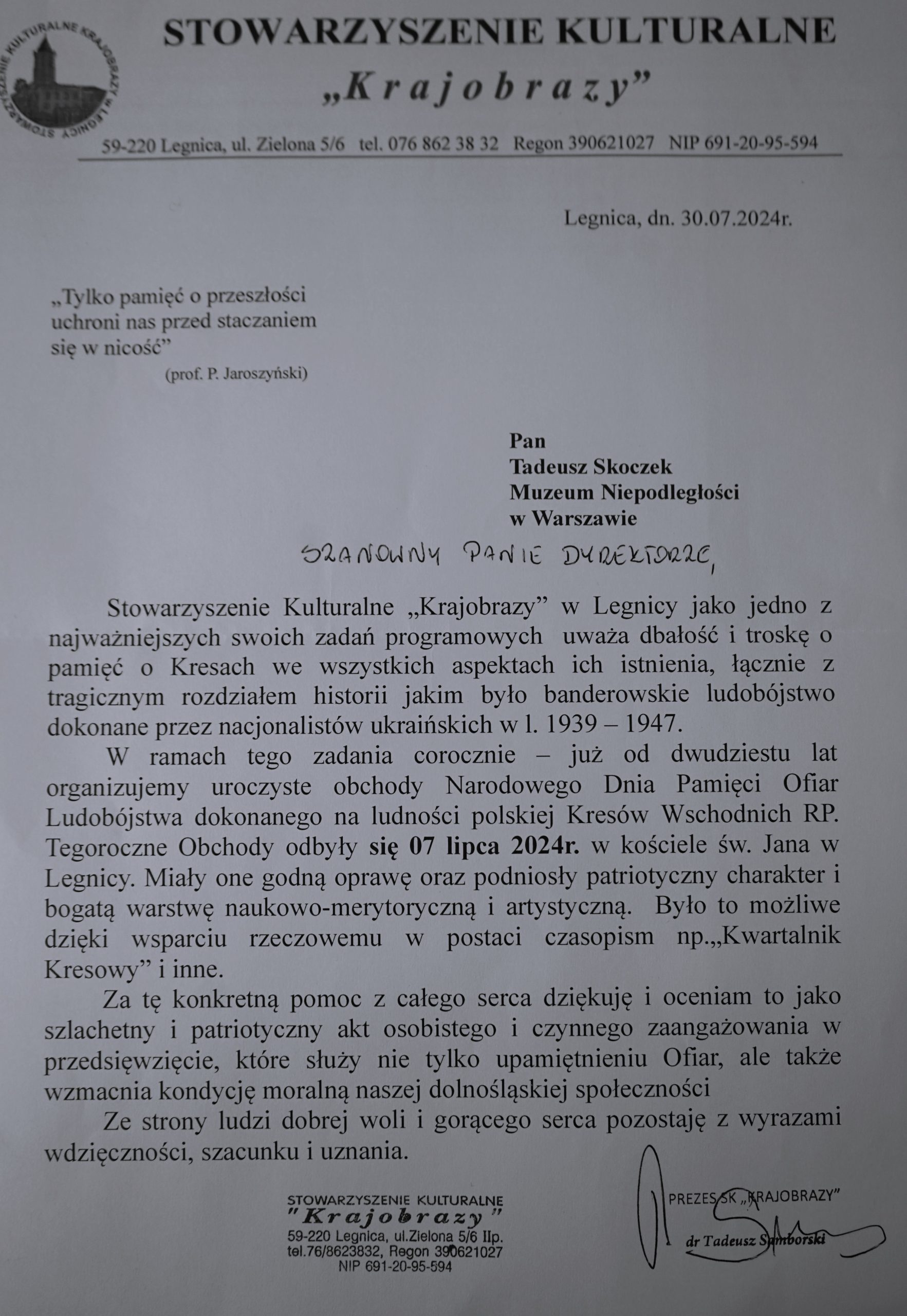 Prezentujemy podziękowanie, jakie Tadeusz Skoczek, dyrektor Muzeum Niepodległości, otrzymał od Tadeusza Samborskiego, prezesa Stowarzyszenia Kulturalnego „Krajobrazy”.
